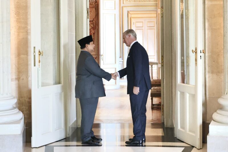 Tampak mendampingi Presiden Prabowo di Istana Laeken yaitu Sekretaris Kabinet Teddy Indra Wijaya dan Duta Besar Luar Biasa dan Berkuasa Penuh Republik Indonesia untuk Kerajaan Belgia Andri Hadi.